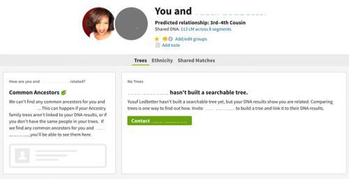 There’s another key match among our shared matches (estimated to be a 4th-6th cousin) who clearly reveals a grandparent relationship tied to the era of American slavery. Though they have a well-sourced family tree tied to their DNA profile, there are no common surnames or geographical locations documented among our trees. This is a reflection of the realities of slavery in the U.S. and calls for more in-depth research techniques to identify our common grandparents. Determining our kinship with this mystery DNA match is in my queue of research goals to be addressed in the future.